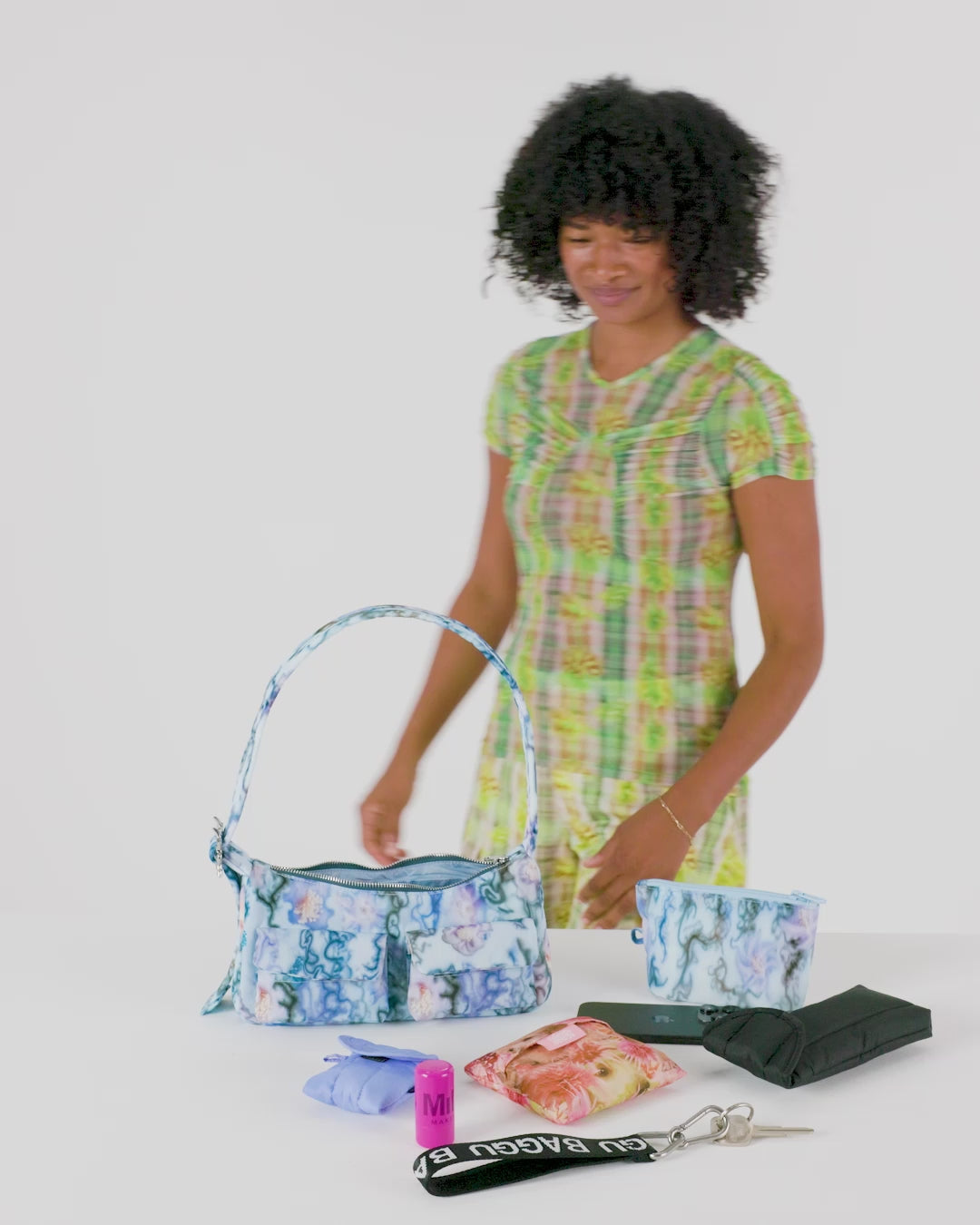 A Cargo Shoulder bag in Painted Wildflower from BAGGU. A baguette style purse with two external flap pockets for quick access to your essentials.