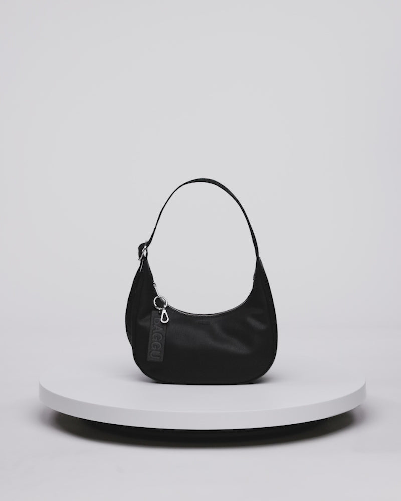 BAGGU's small recycled leather crescent bag in Black. A smaller crescent shape in recycled leather. Elevated, durable, and designed to fit the essentials. Features an interior zip pocket and thoughtful additions like a key leash and debossed keychain.